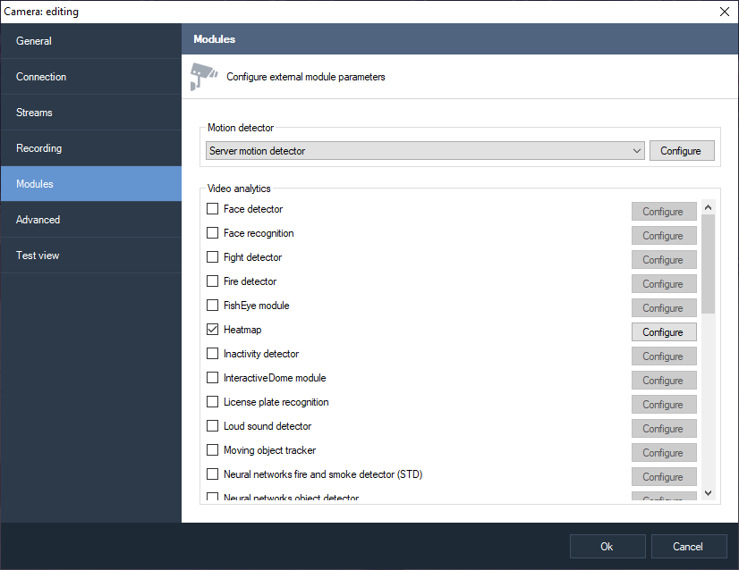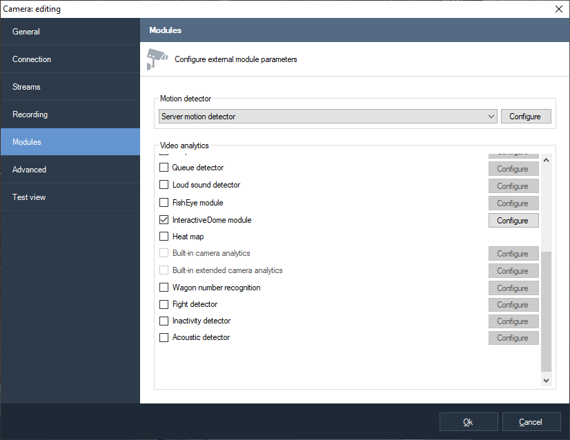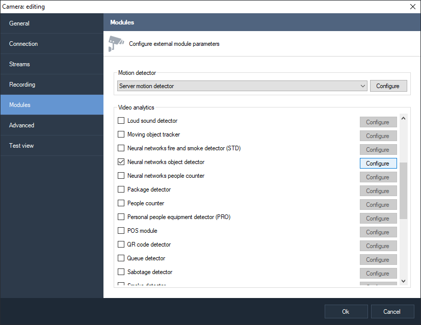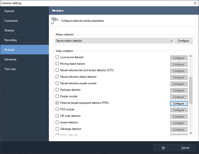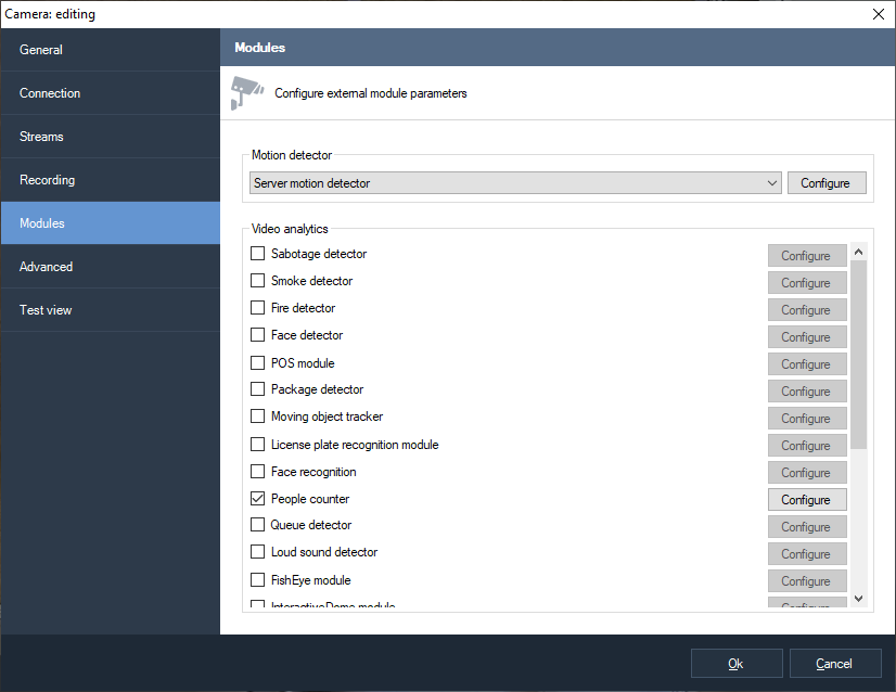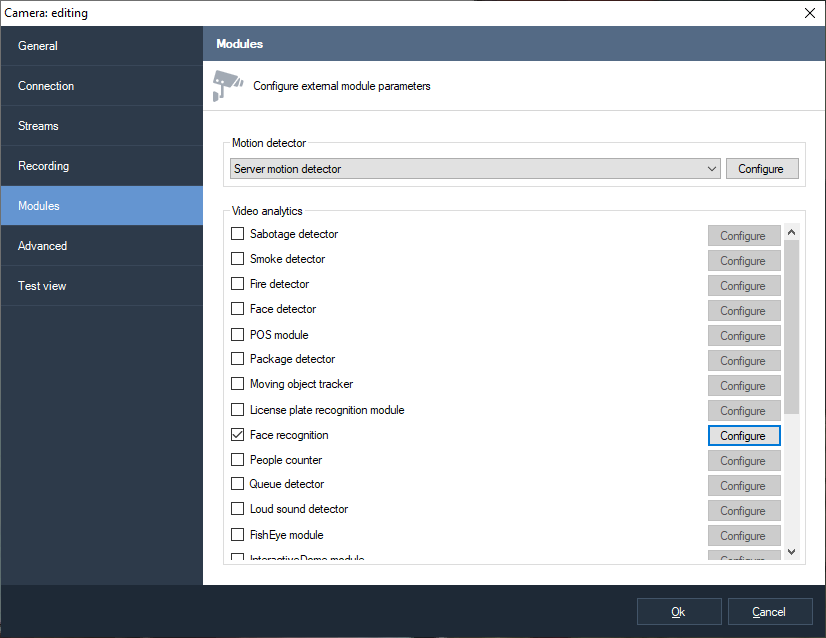 Enabling, disabling, and configuring modules is performed on the «Modules» tab of the camera settings window in the SagitechVMS Client application. Select the desired module and click the configure button to adjust its parameters.