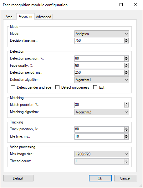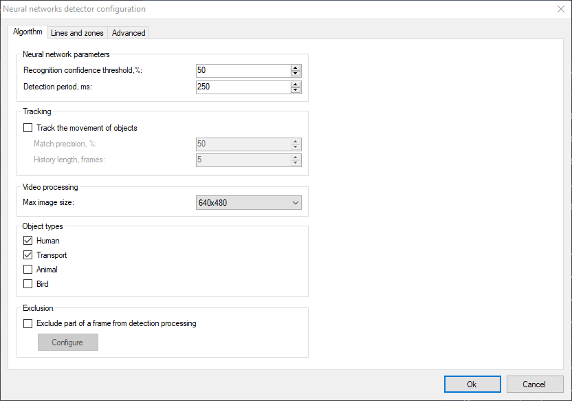 This tab allows you to configure neural network parameters, tracking and video stream processing.