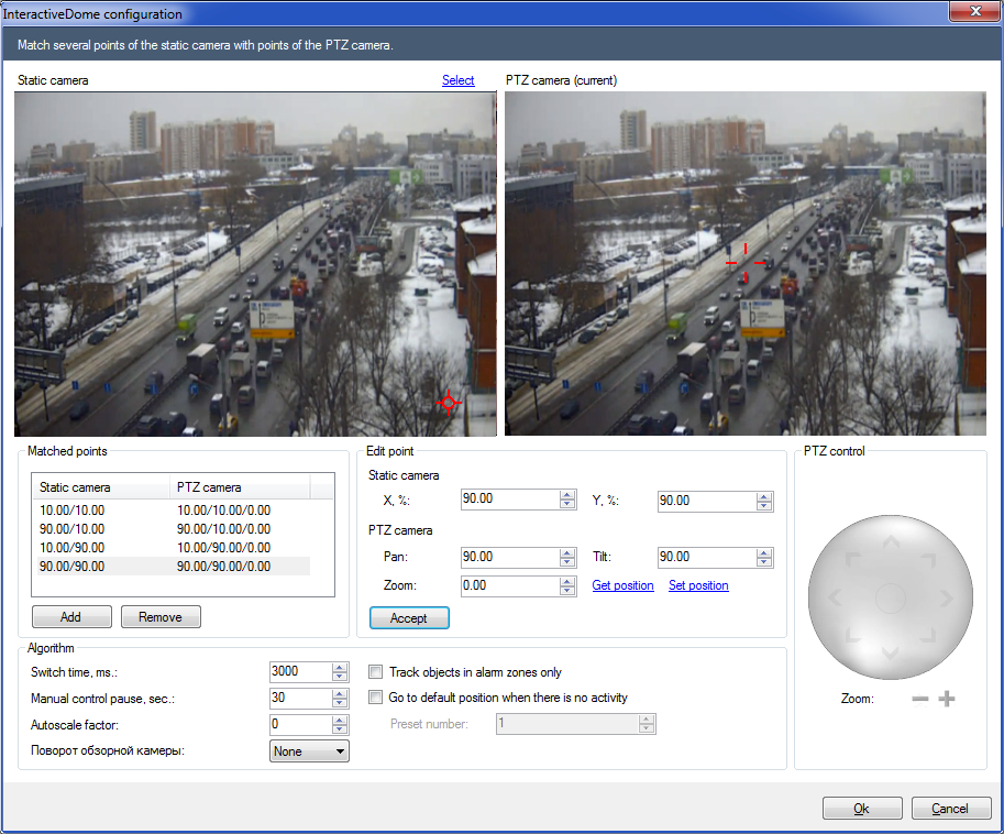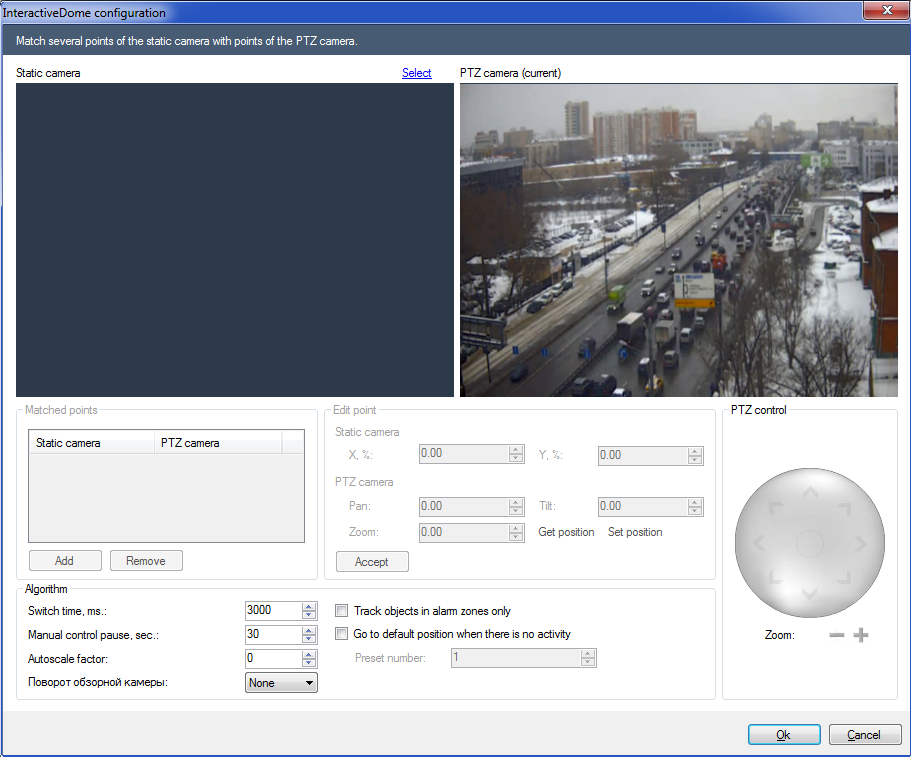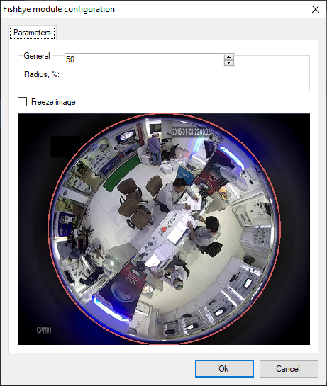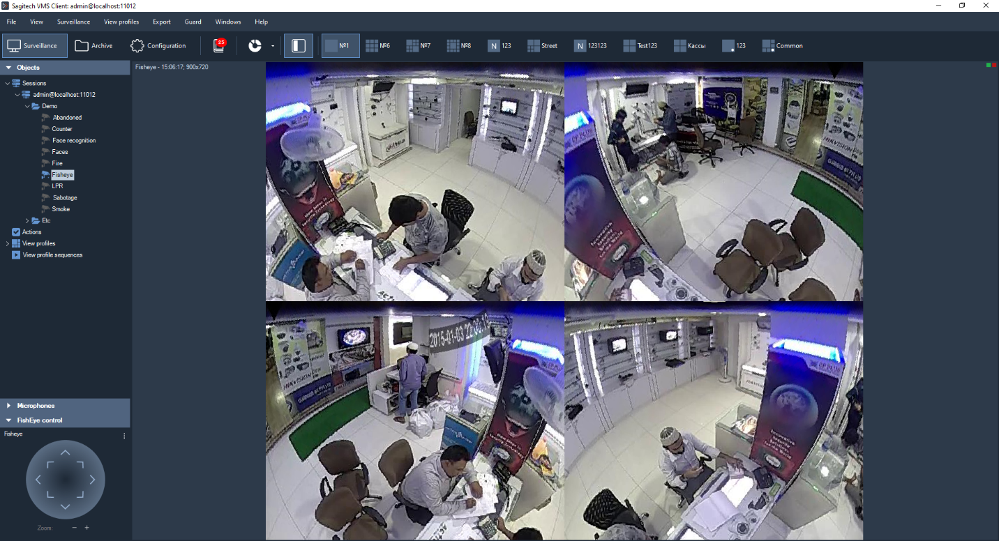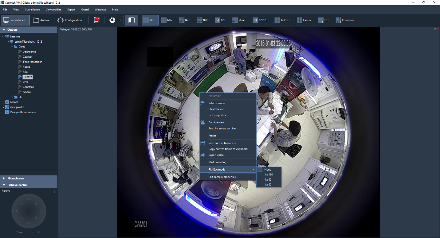 Fisheye conversion module. Allows you to expand the round image obtained from the fisheye camera lens in one of three ways: 1x90 degrees, 2x180 degrees, and 4x90 degrees. Allows you to control the rotation angles and zoom with the virtual PTZ interface.