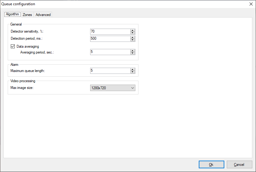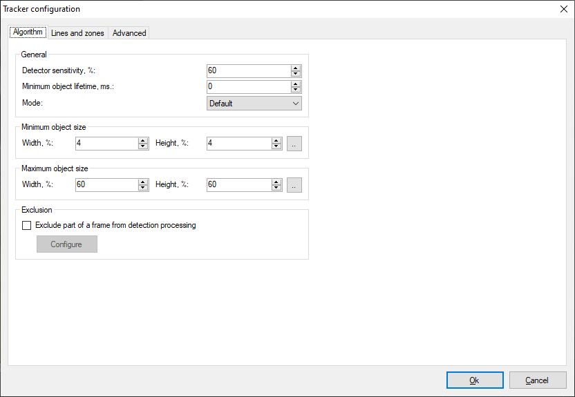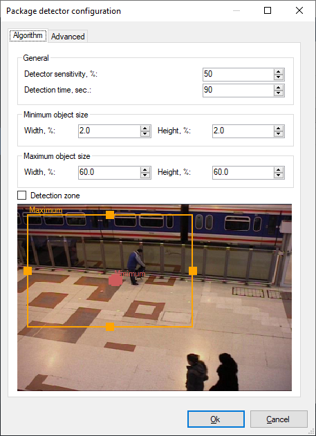 In the settings of the detector of abandoned objects, there are two tabs "Algorithm" and "Advanced". In the "Algorithm" tab, we can adjust the sensitivity of the detector, set the detection time, and select the minimum and maximum size of the left object.