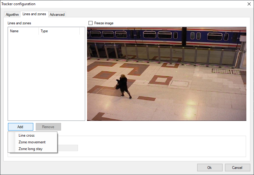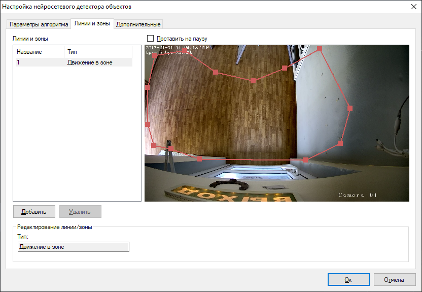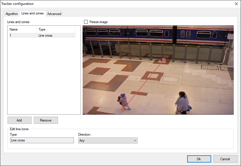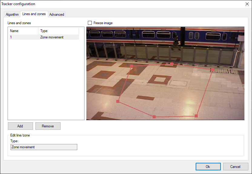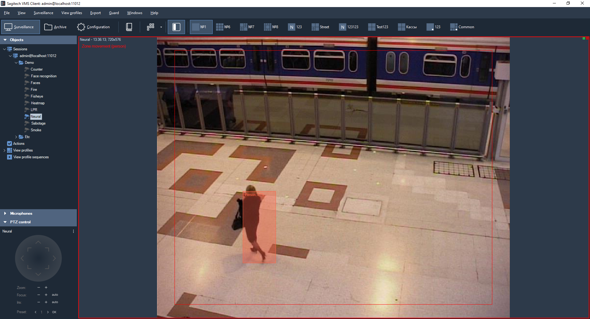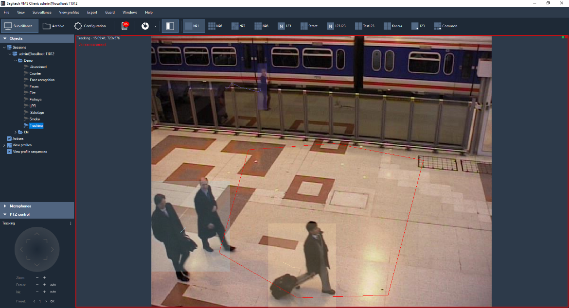 Tracking module. Monitors the movement of objects in the frame, making the construction of movement paths. Generates alarm events when an object crosses a specified line, moves in a certain zone, or stays in the specified zone for a long time.