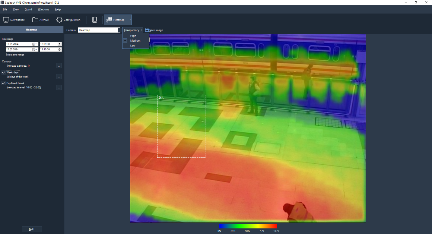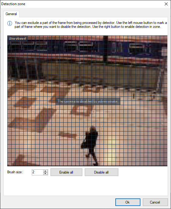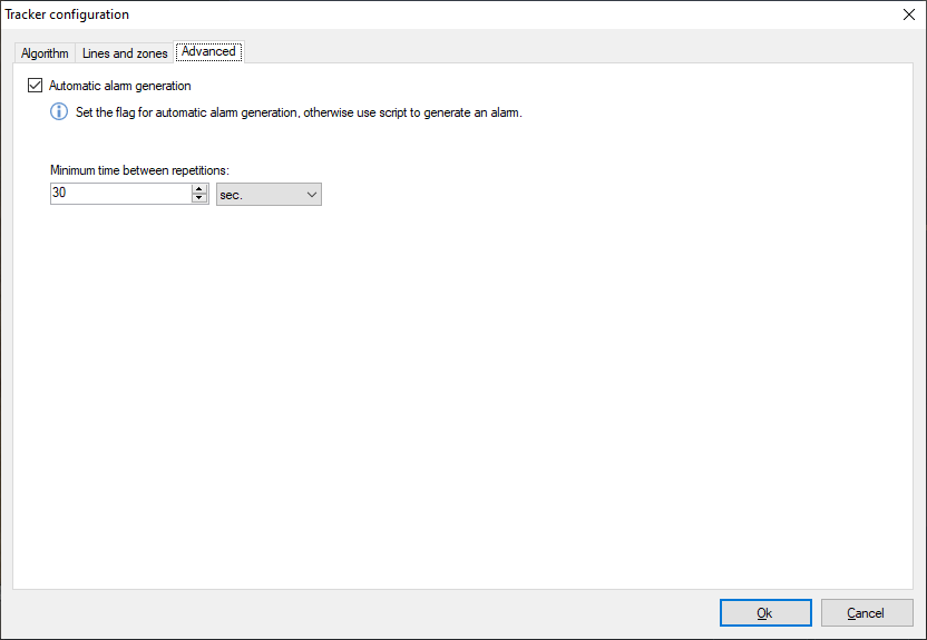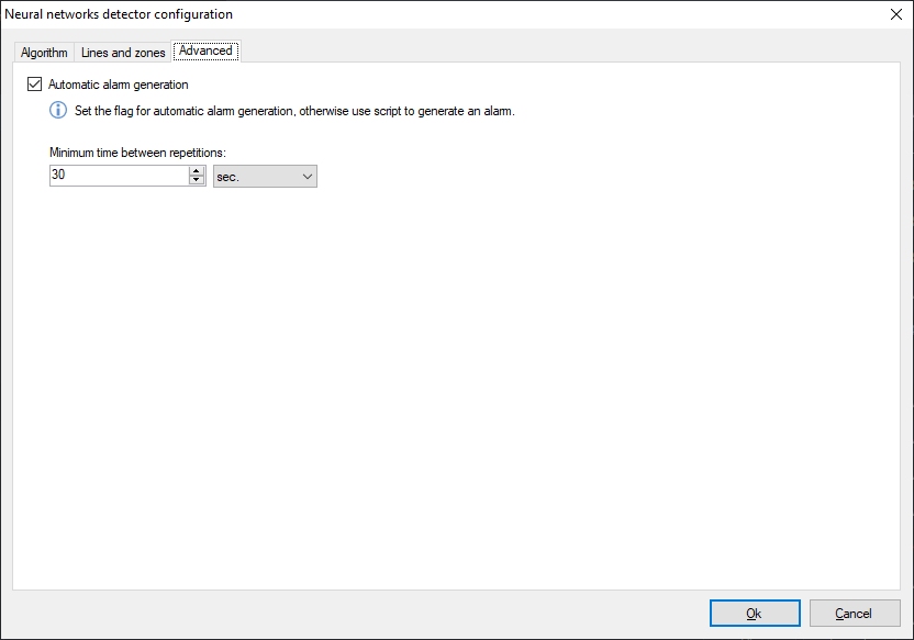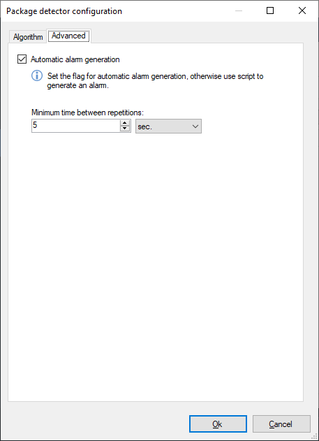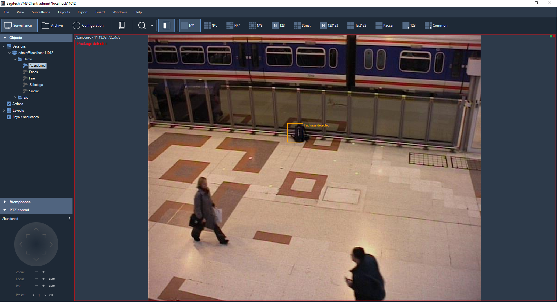 When an abandoned item is detected, the module generates an alarm that will be transmitted to the security post (the SagitechVMS Client application with the «Guard mode» enabled) and the information about it will be saved in the archive. You can set a minimum time interval after which a repeat alarm will be generated. This parameter can be set in the "Advanced" tab.
