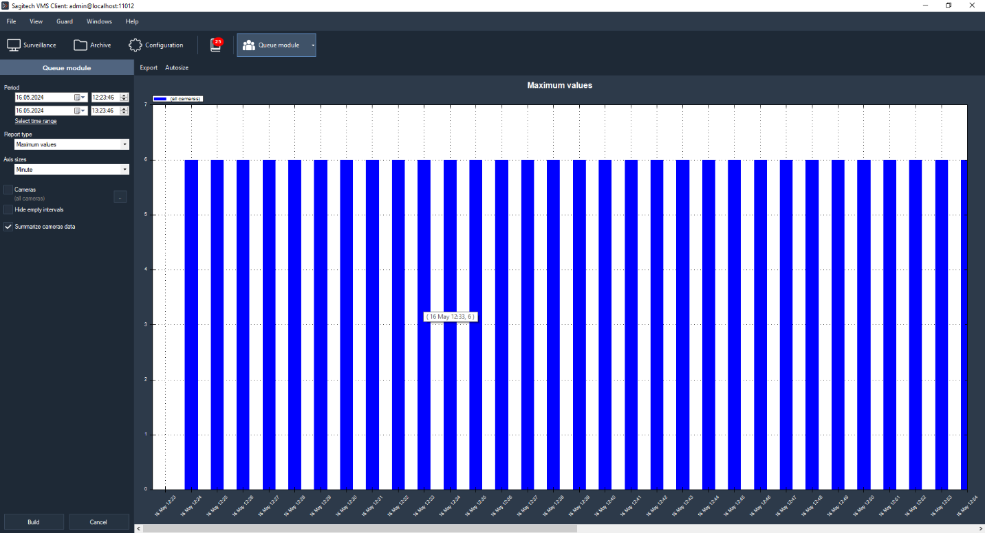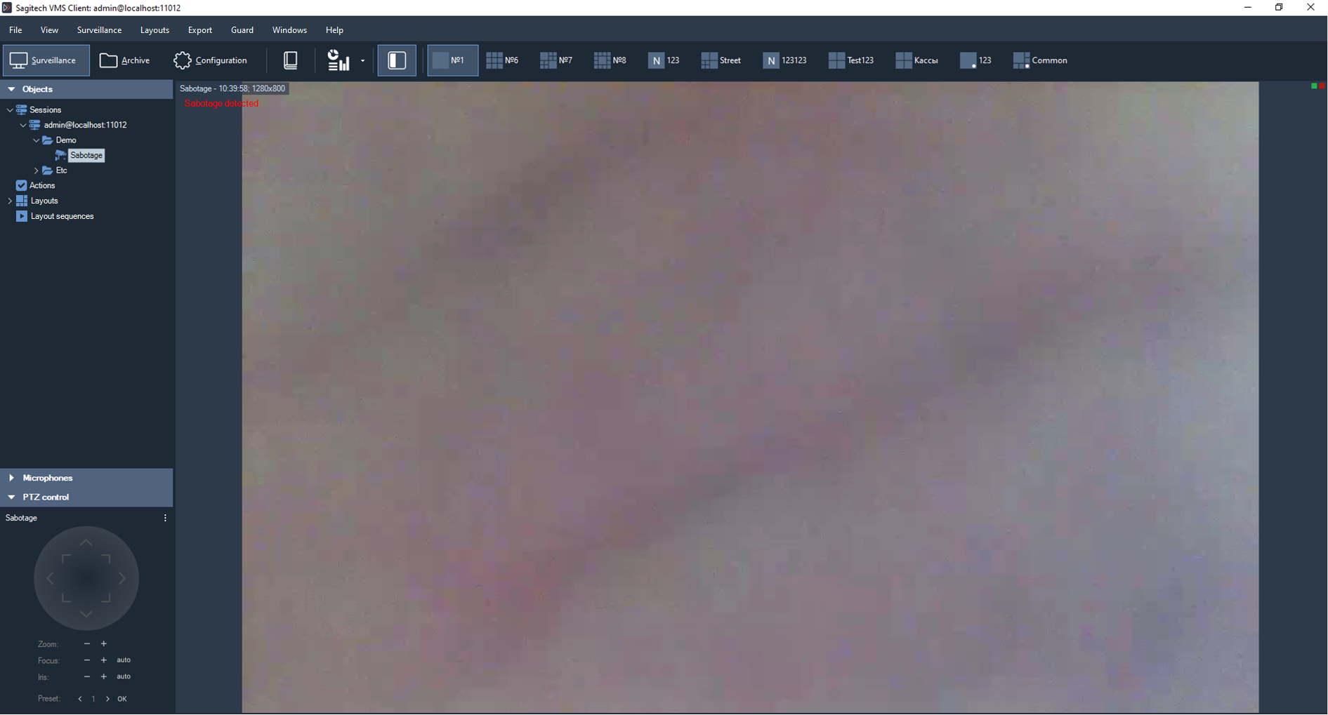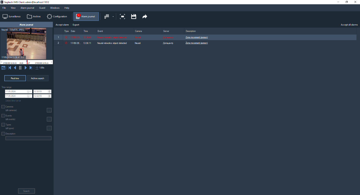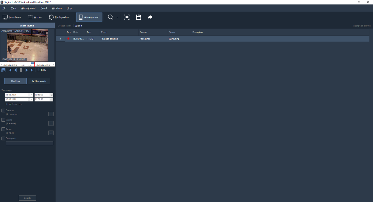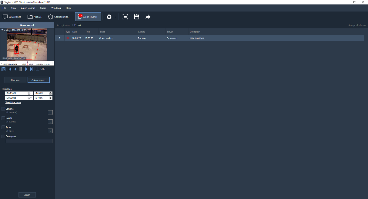 If one of these events is detected, the module generates an alarm that will be sent to the security post (the SagitechVMS Client application with the «Guard mode» enabled) and the information about it will be saved in the archive. You can set a minimum time interval after which a repeat alarm will be generated.
