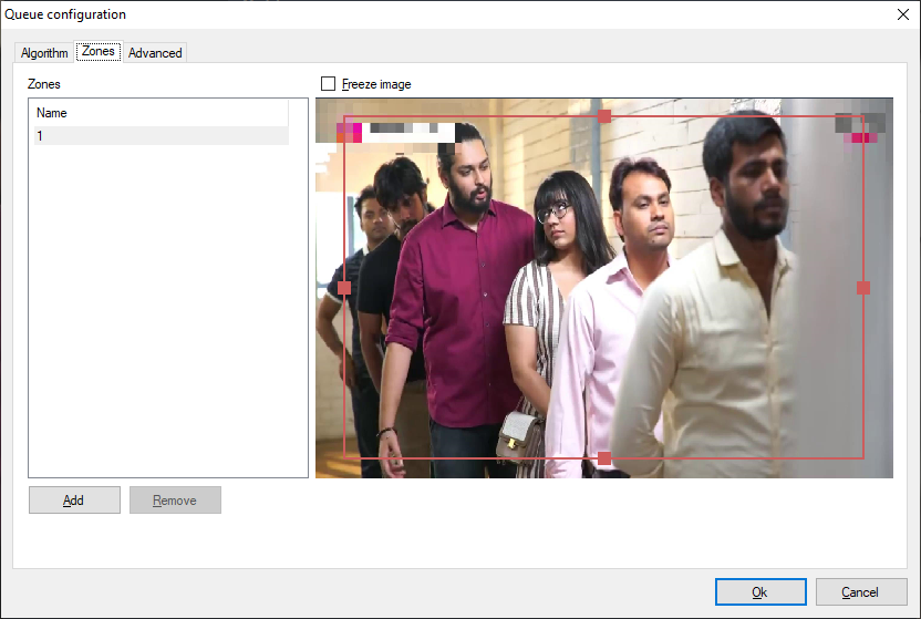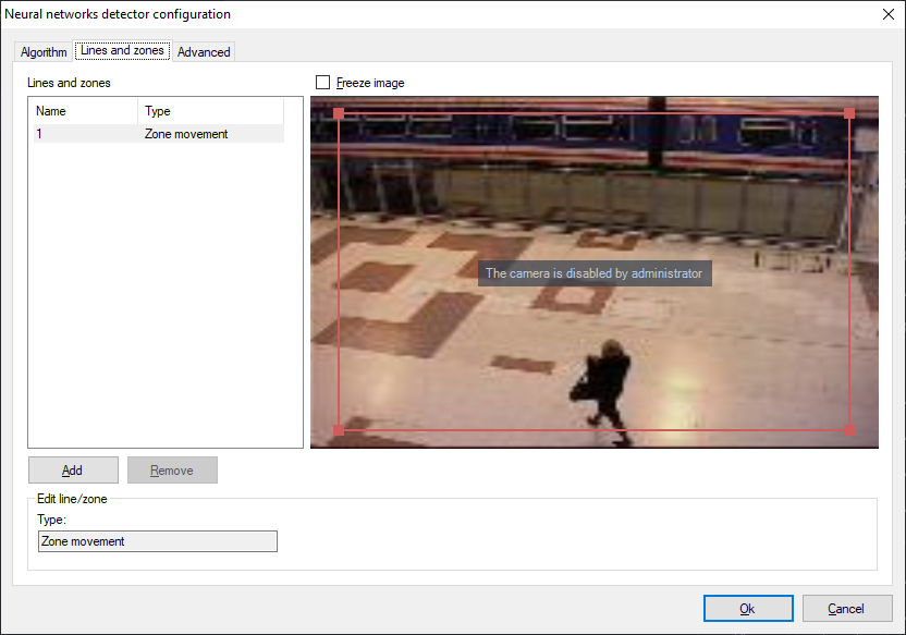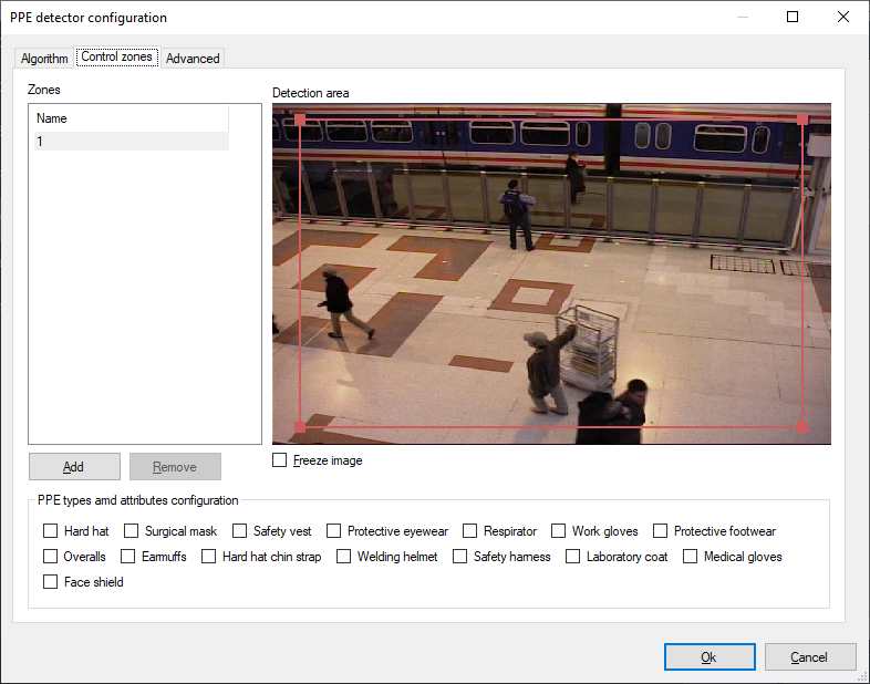 Detection zone. This area defines the area in which the PPE detection will be performed. It is recommended to limit this area by excluding non-essential parts of the frame from the analysis.