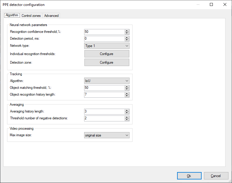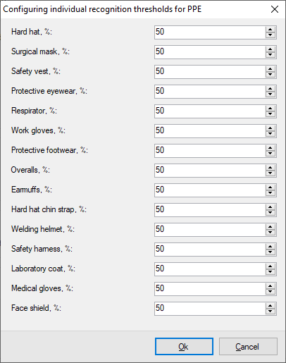 Individual recognition thresholds. This parameter allows you to set the accuracy of object detection for each type of PPE.