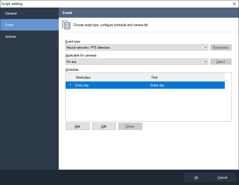 In the "Configuration"-"Scripts" section, you can add a script with the event type "Neural Networks: PPE Detection".
