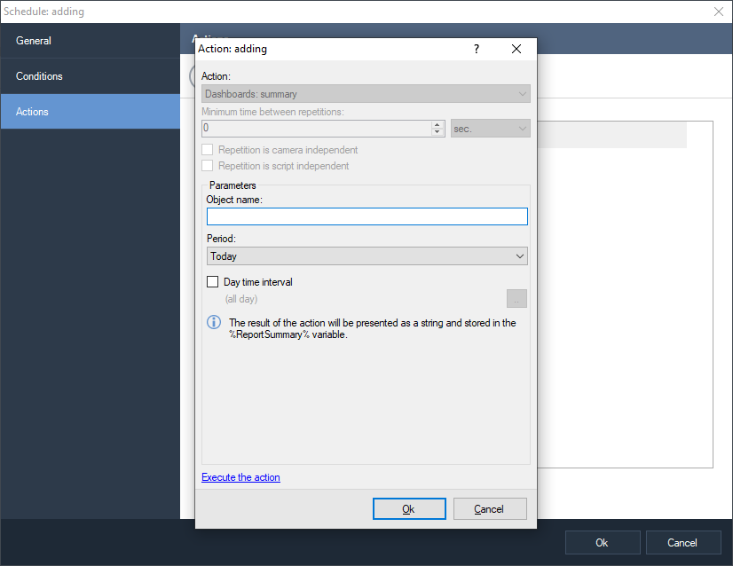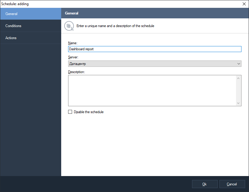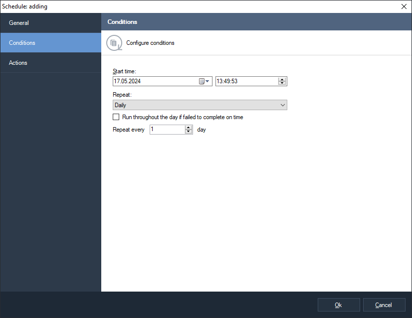 In the "Conditions" tab, set the start time of the required actions, the type of repetition, etc..