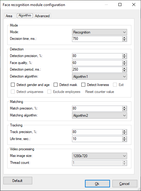 After that, the button for opening the module settings window will be available. In this window, you can set the desired quality of the module – medium or high. Average quality is set by default. When working in high-quality mode, the CPU resource consumption will be higher, but the number of detected faces will also increase.