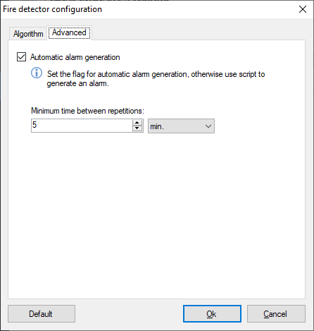 If you do not need to generate an alert, you can disable the corresponding flag. In this case, the message about fire detection will still be displayed on top of the camera's video stream in surveillance mode.