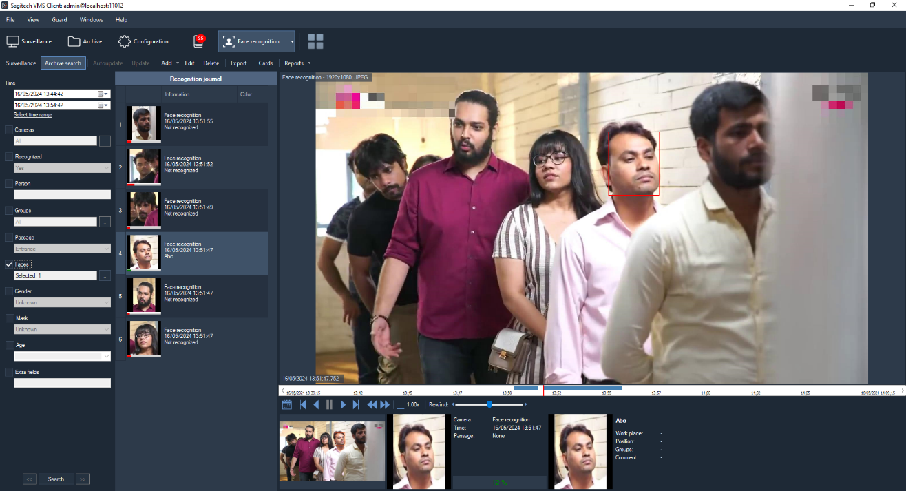 Face recognition module. Detects and recognizes faces in the video stream. Allows you to maintain a database of employees with automatic face identification in real time, as well as the ability to split into groups (white and black lists). Supports searching the archive by a set of criteria.
