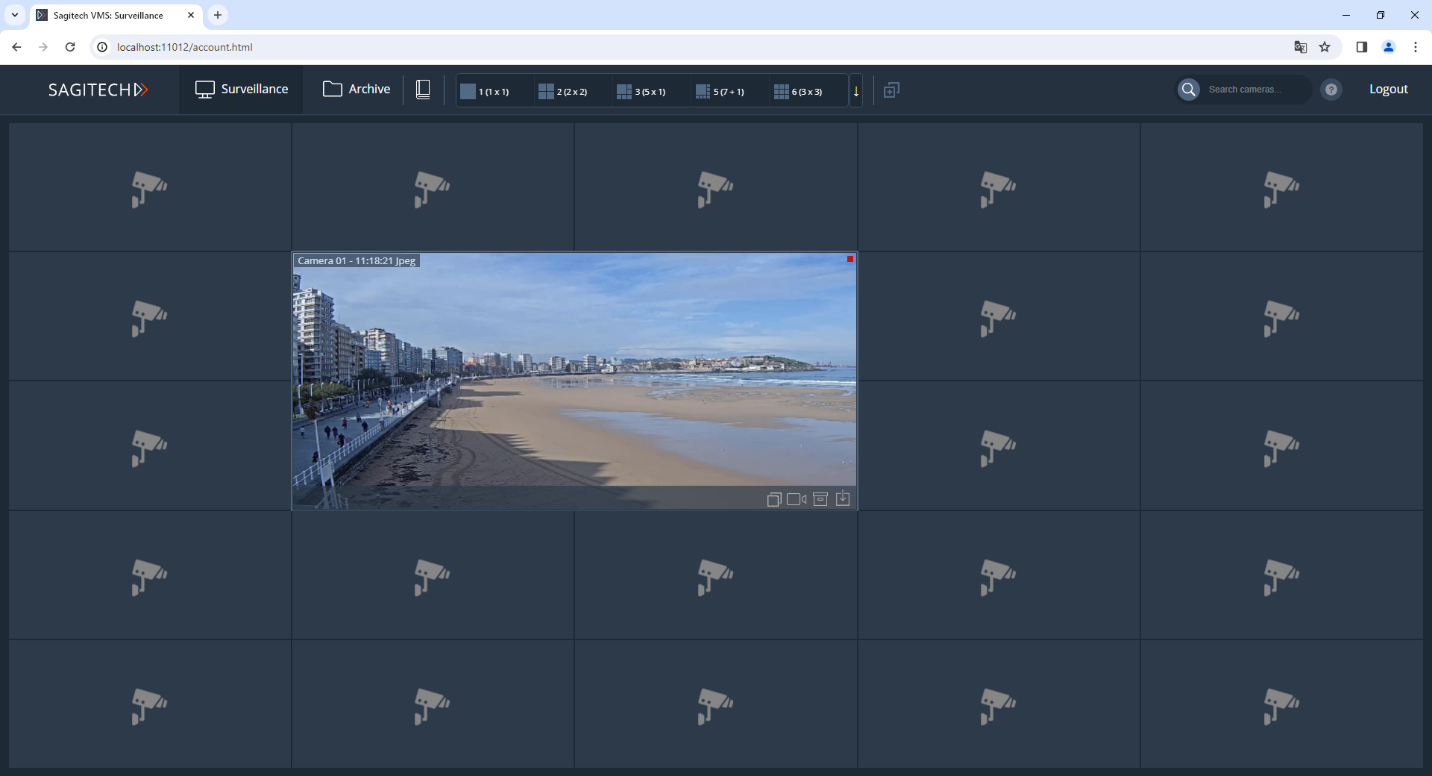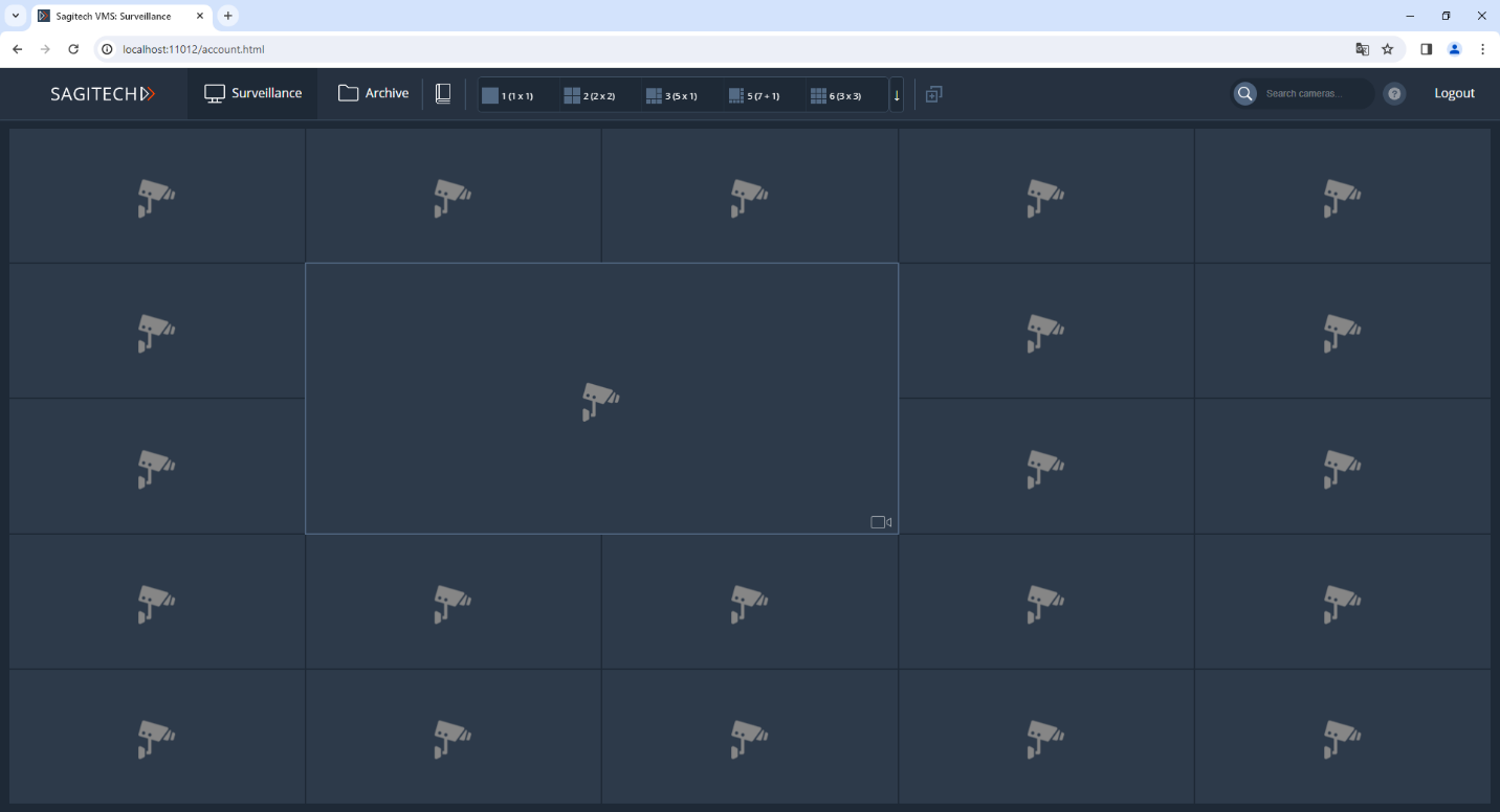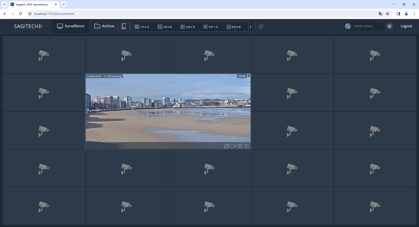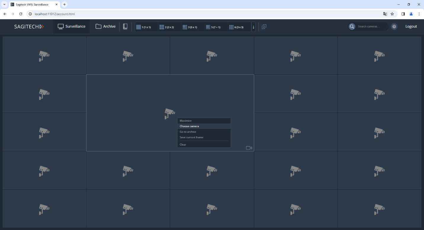 After entering your username, password and clicking the "Login" button, you will be redirected to the real-time surveillance page. For viewing in this mode, your own layouts are available through the browser, as well as through the Sagitech VMS Client. You can select the cameras needed for playback by pressing the RMB through the context menu. Please note that these changes to browsing layouts are not saved to the server and will be lost after the end of the Web session.