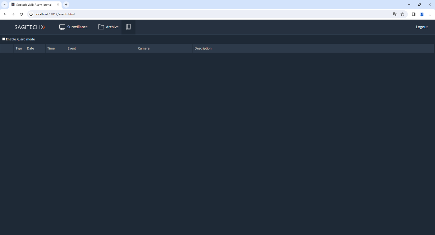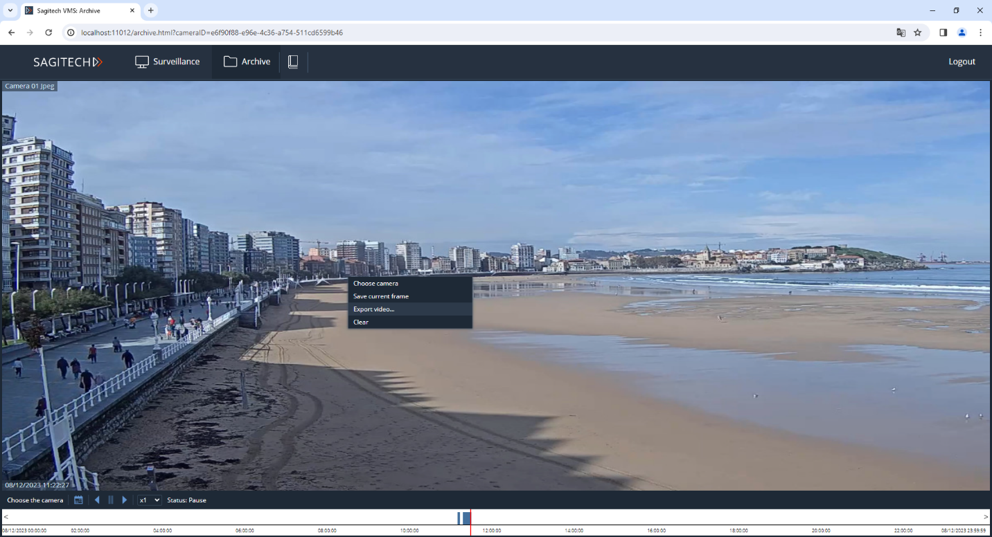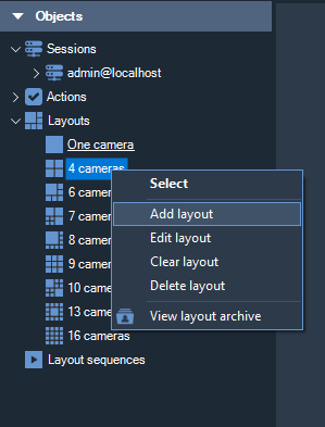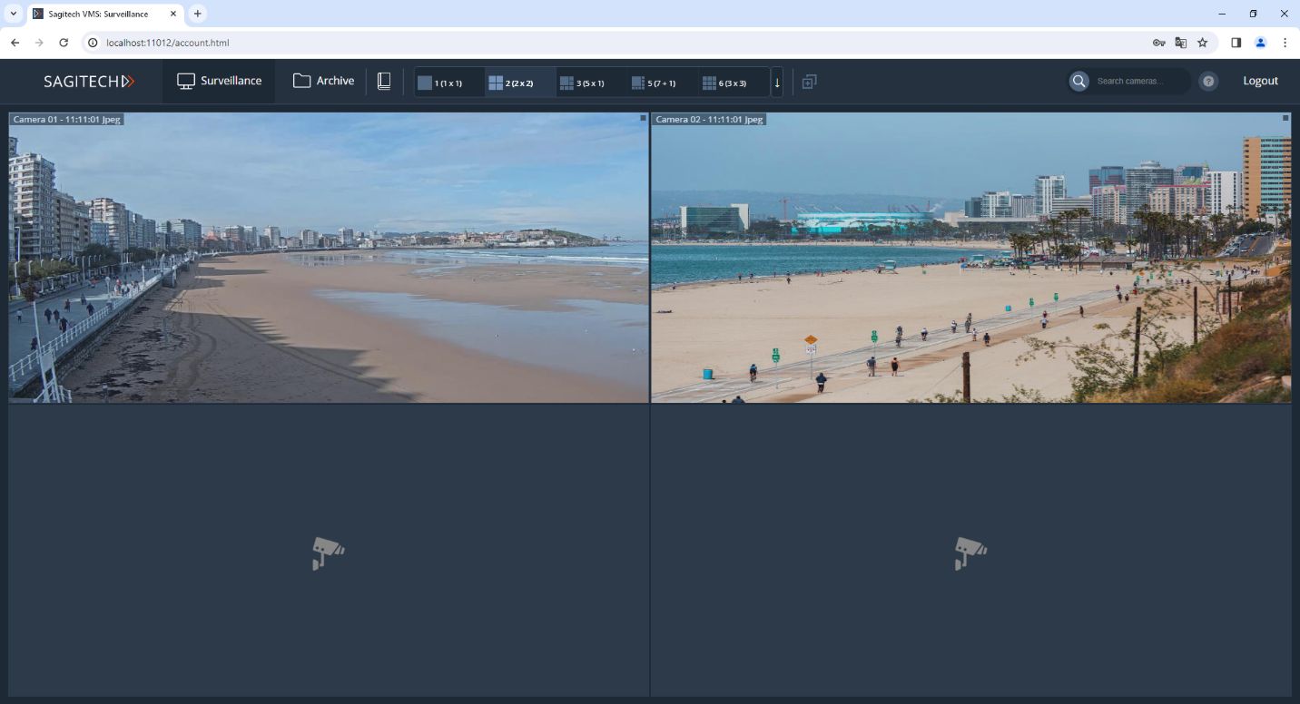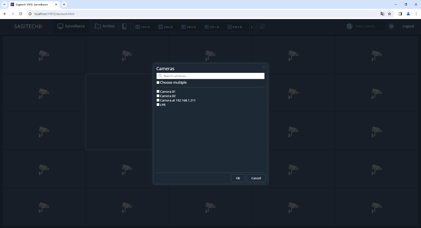 After entering your username, password and clicking the "Login" button, you will be redirected to the real-time surveillance page. For viewing in this mode, your own layouts are available through the browser, as well as through the Sagitech VMS Client. You can select the cameras needed for playback by pressing the RMB through the context menu. Please note that these changes to browsing layouts are not saved to the server and will be lost after the end of the Web session.