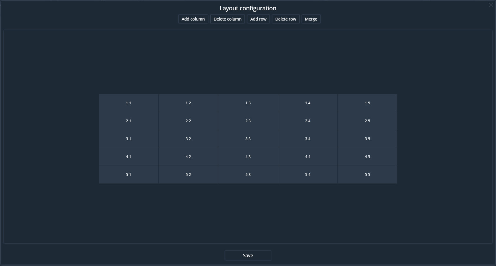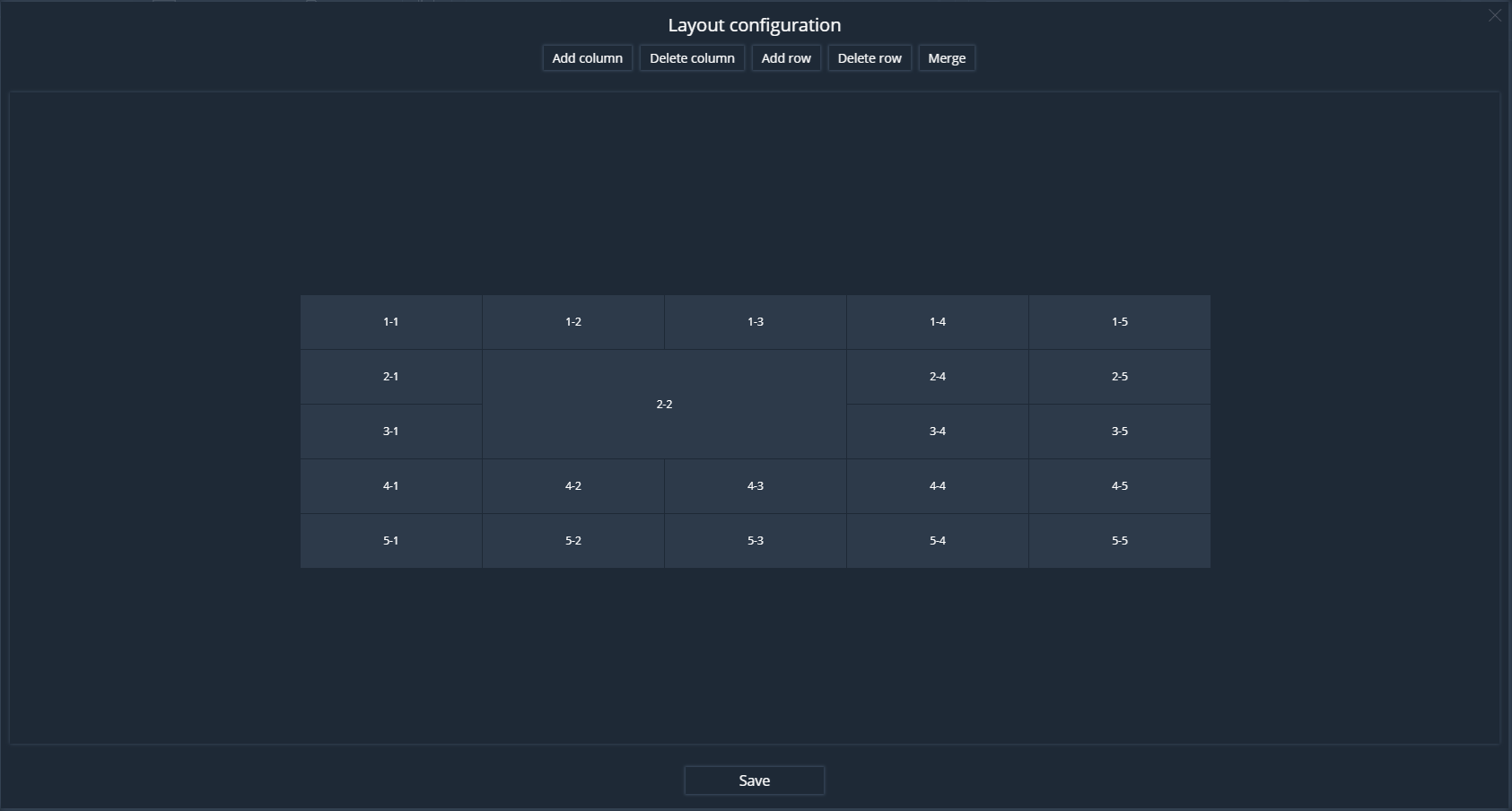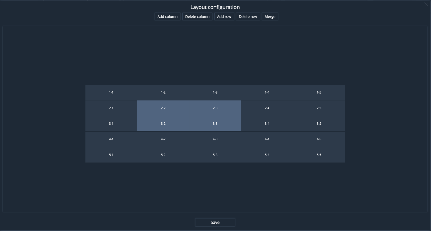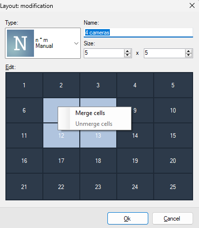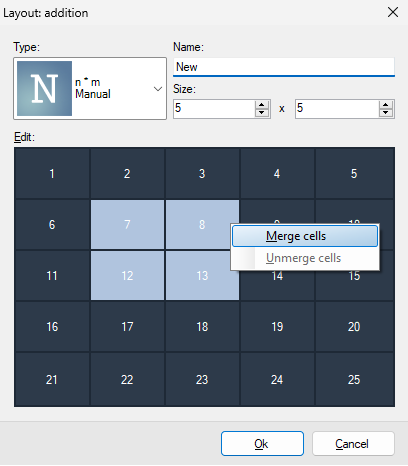 In the Layout addition window, you must select the number of rows and columns. By clicking on the LMB cells, the cell is selected for subsequent merging.