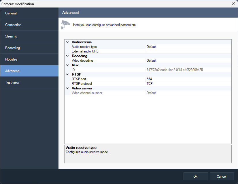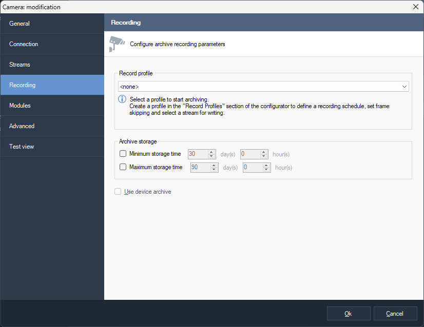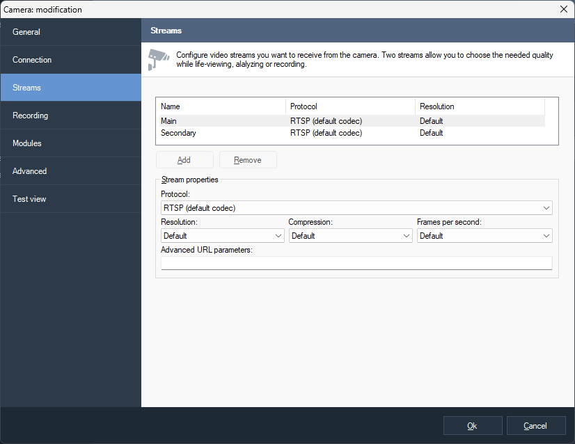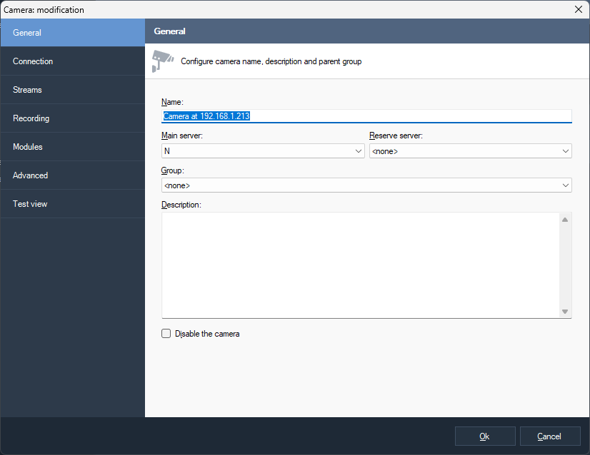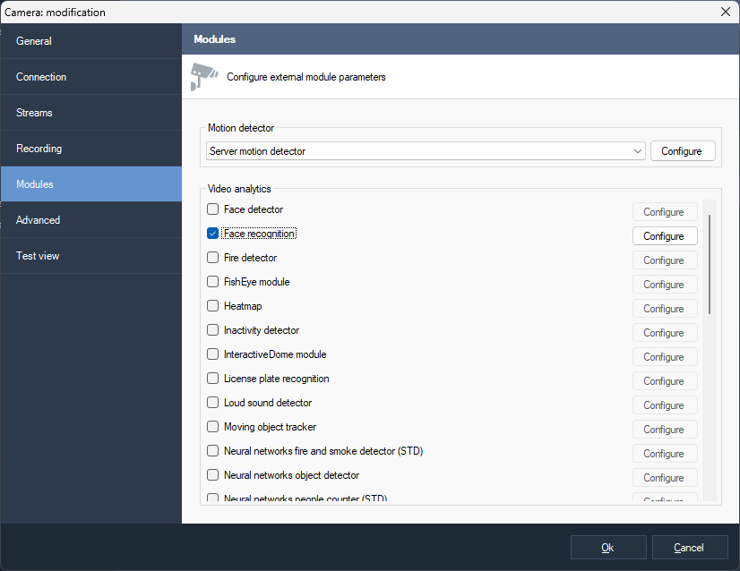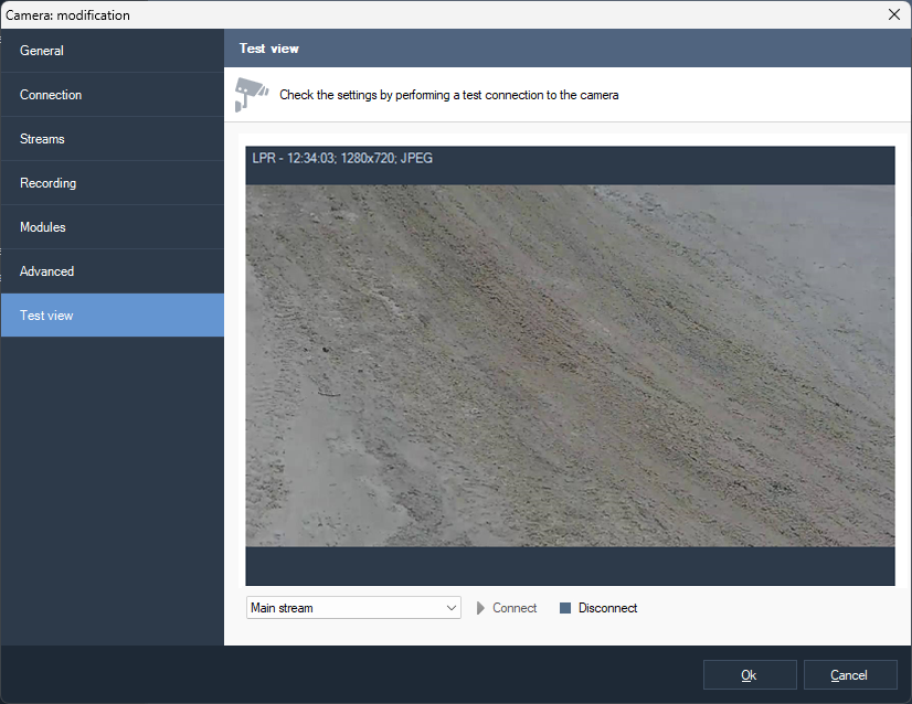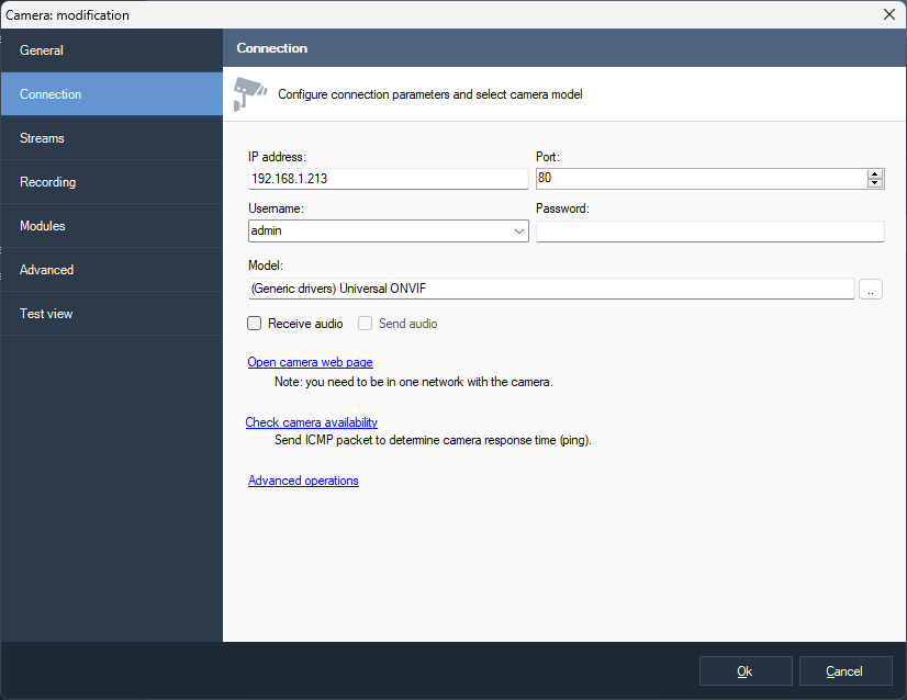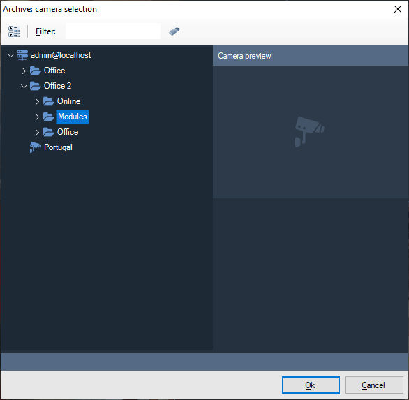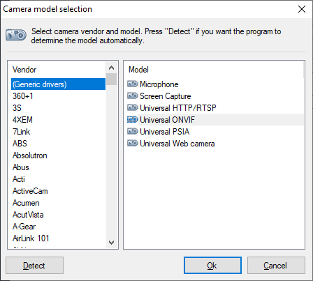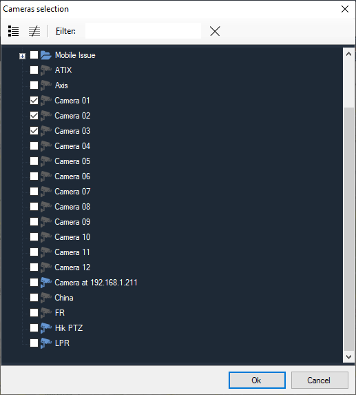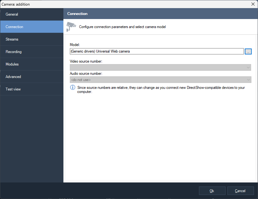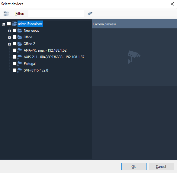 In the camera selection window, select the camera and click Ok.
