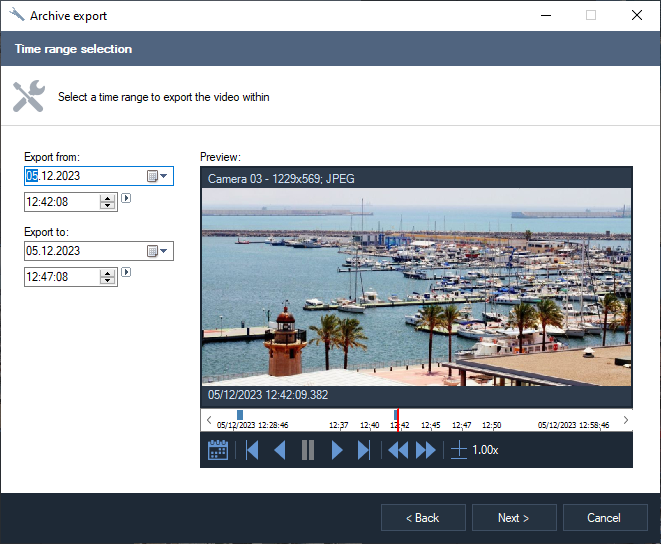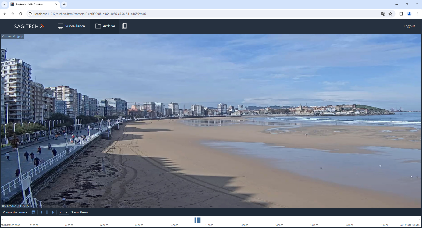 To switch to archive mode, select the archive link in the upper left part of the interface. The selection of the camera for viewing is carried out in the same way as the selection in the surveillance mode. The interface supports playback in forward and reverse directions at a given speed and switching to the required date and time.