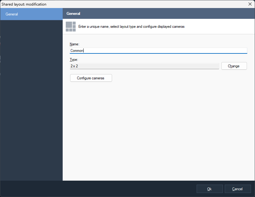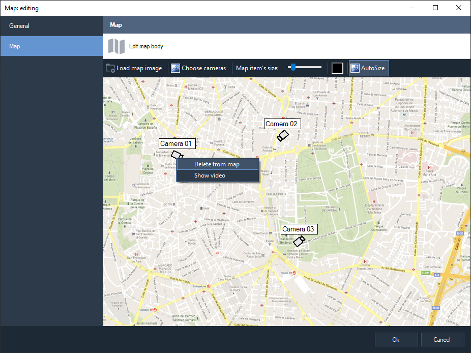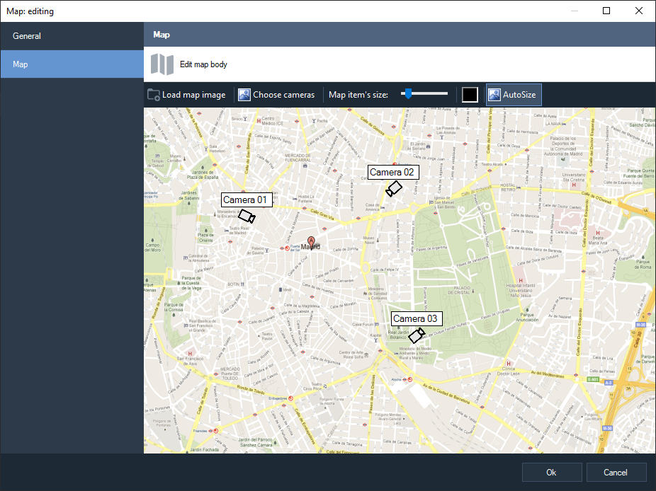 In the "General" tab, you must specify the name of the map, in the "Map" tab, a list of servers and cameras is displayed on the left, and the map workspace is on the right.