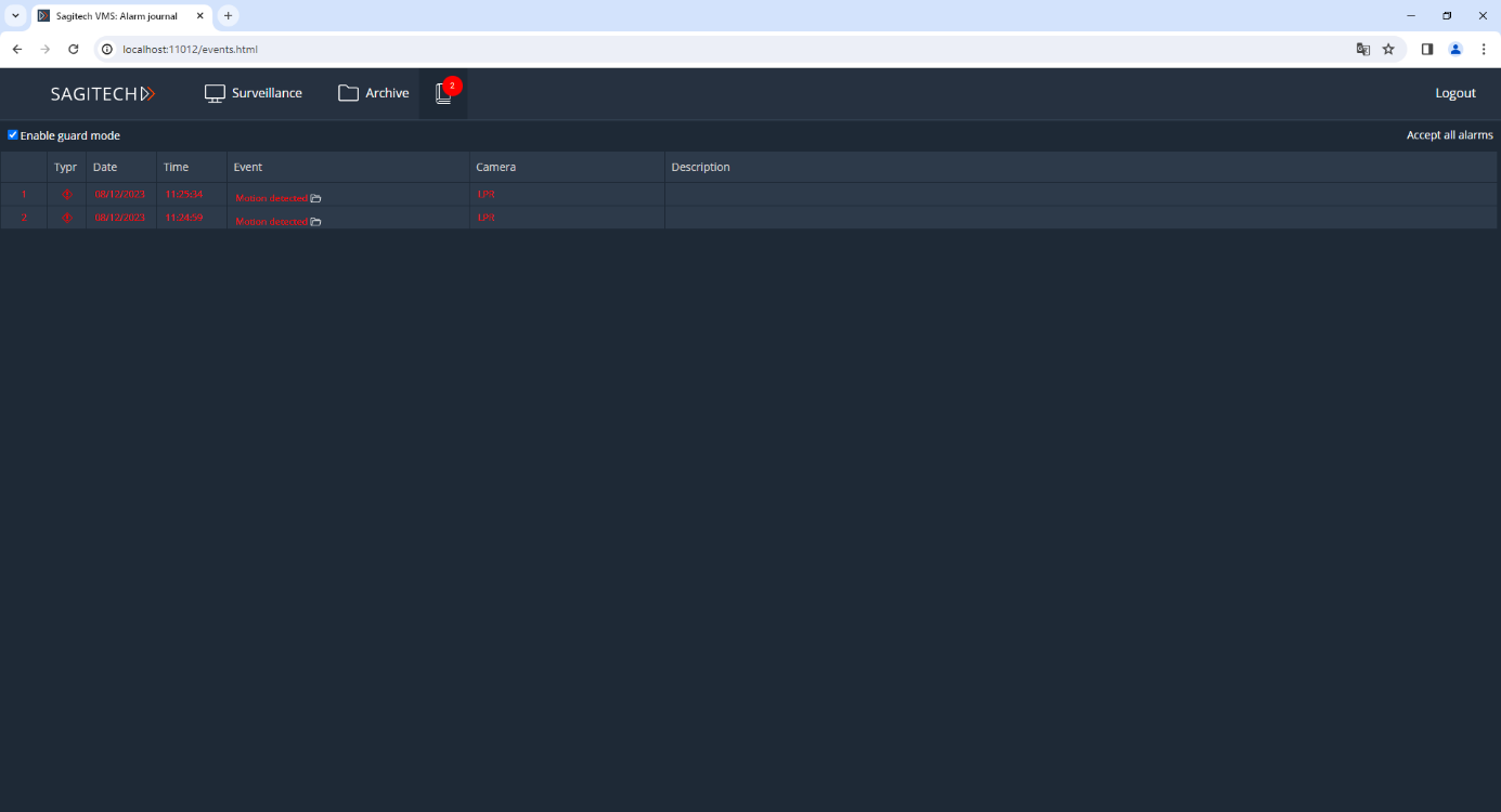 To confirm the event, click on a row in the table or the "Accept all alarms" button.