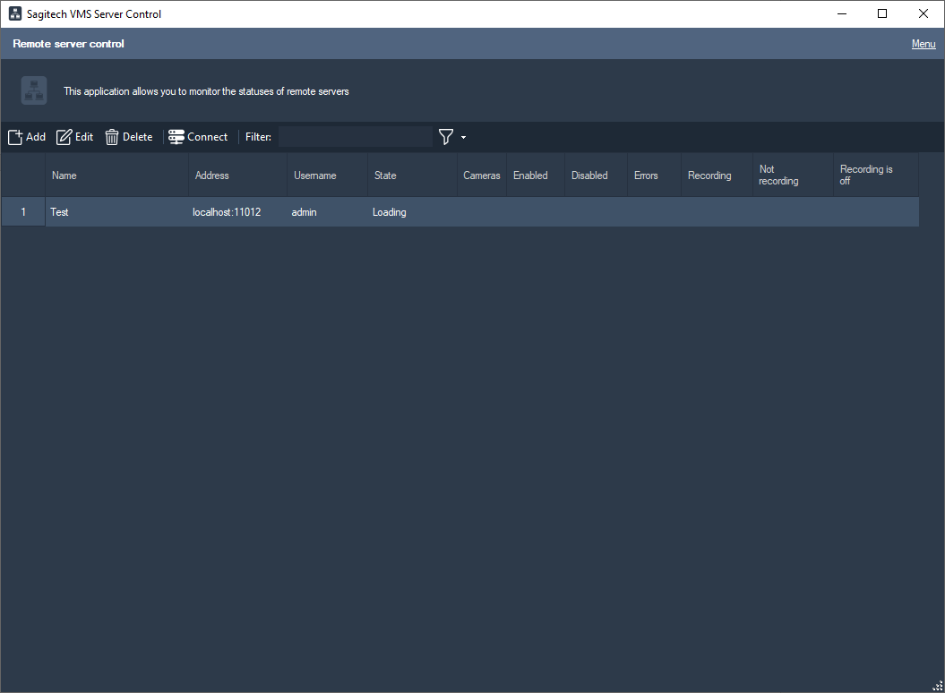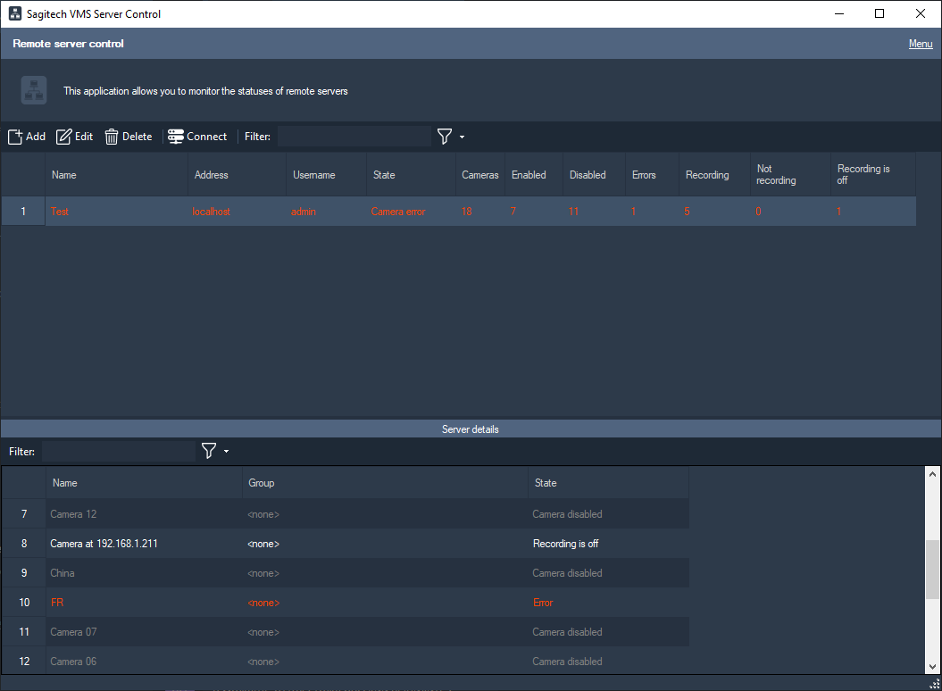 The Sagitech VMS Server Control Utility allows to trace the relevant status of the set of remote Sagitech VMS servers. For every server the application provides the ability in real time to monitor its accessibility and the status of cameras: how many cameras are processed on the server, how many cameras are activated or deactivated, for how many cameras the recording is enabled and how many cameras are recording data to disks at the current moment.